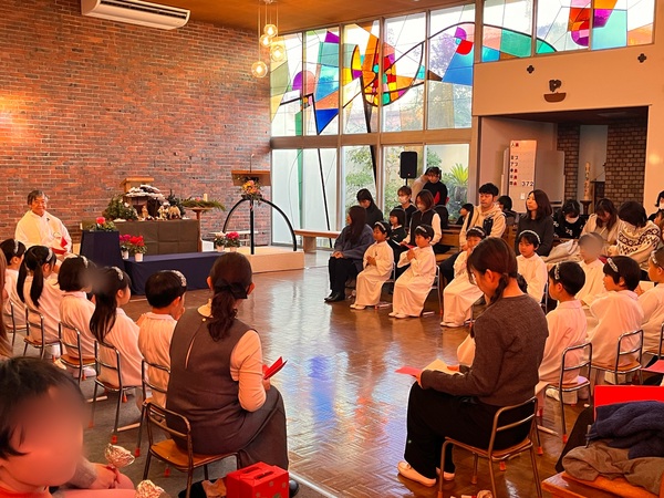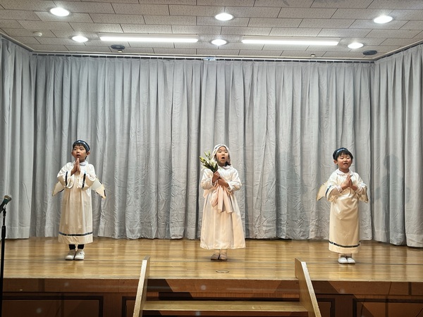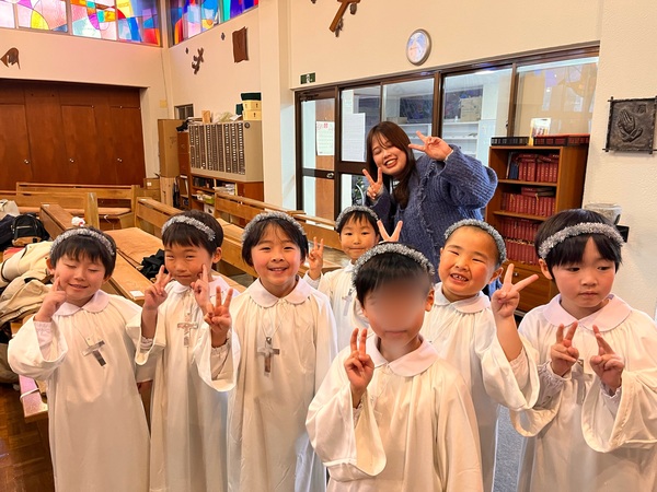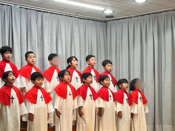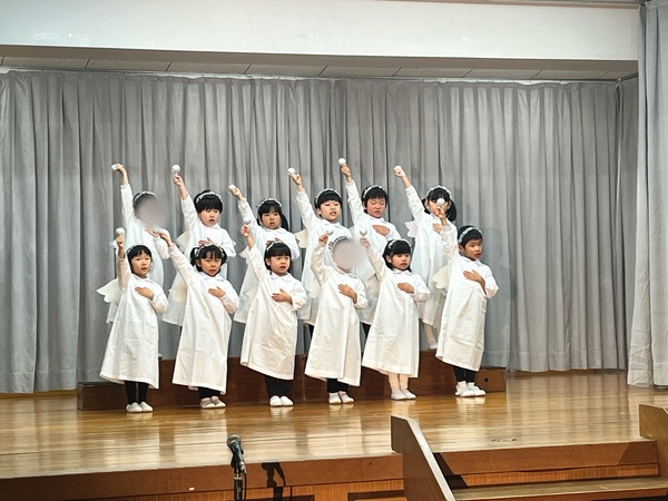 年中は羊飼いにイエス様がお生まれになった嬉しい出来事を伝える天使の大軍の役です。心を込めてお歌を歌いました。