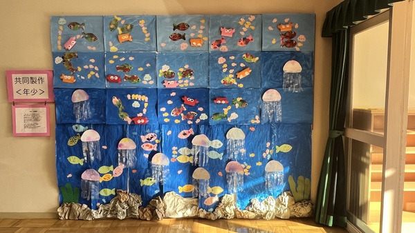 年少さんの共同作品です。「海」をテーマに色々な技法を使って製作に取り組ました。「楽しい。」「もっとしたい。」と楽しんで取り組みました。