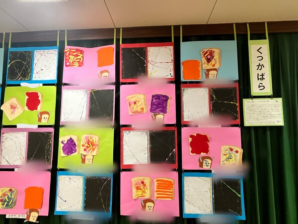 満3歳児絵画です。「パン泥棒」をテーマに描きました。のびのびとしたくっかばらさんらしい作品になりました。