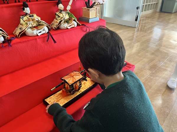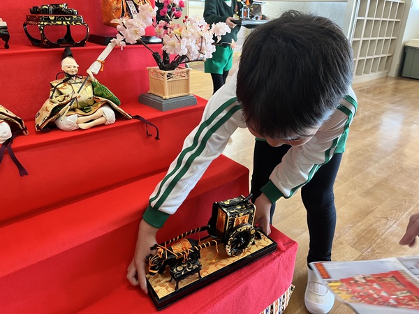 雛人形を見て「わあ、きれい!」と目を輝かせていました。「色々な道具があるんだね。」「これはおひなさまだね」と言いながらお人形をじっくりと見ていました。