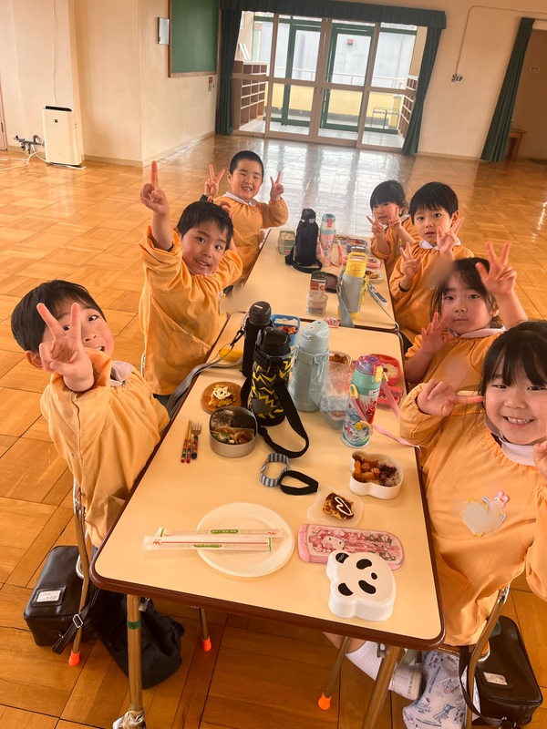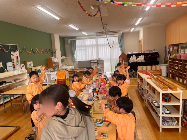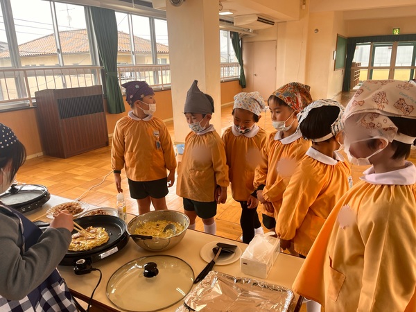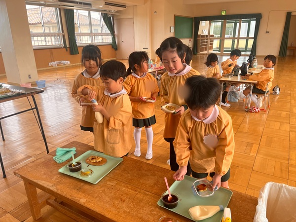 年中さんや年少さん、くっかばらさんも年長さんが焼いたお好み焼きをいただきました。「おかわりしたい人」の声にみん「はーい!」と手をあげていました。