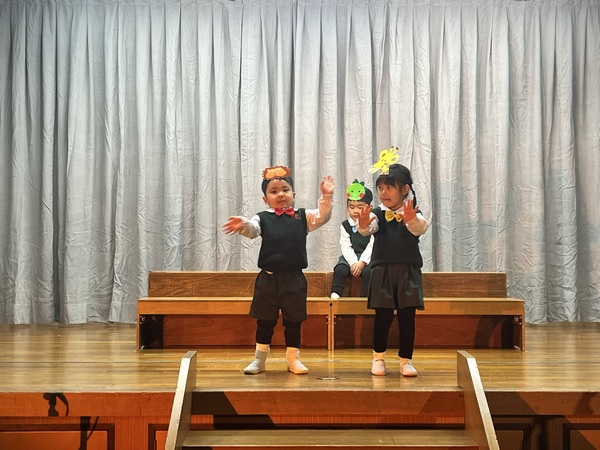 年少さんは神さまが造られた動物の役をしました。大きな声でお歌を歌いました。みんなに手を振って退場する姿もとてもかわいい年少さんでした。