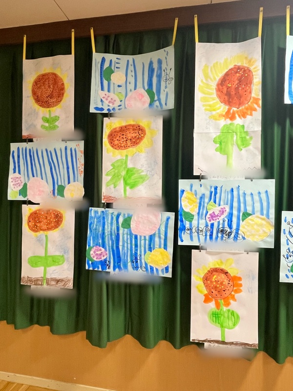 年中さんの絵画です。 スタンプを使ったり思い思いに描くことができました。