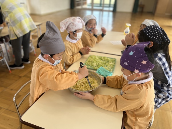 キャベツやこんにゃく、ちくわを切ったり、みんなで順番にまぜたり、とても楽しそうです。