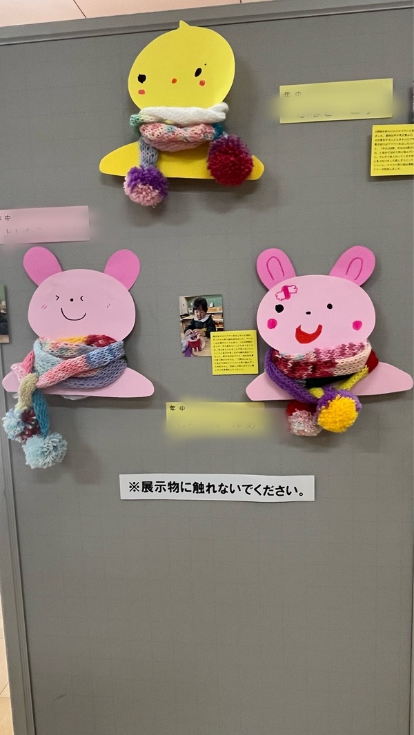 年中さんのマフラーです。目を落とさないよう一生懸命編みました。長いマフラーに大喜びでした。