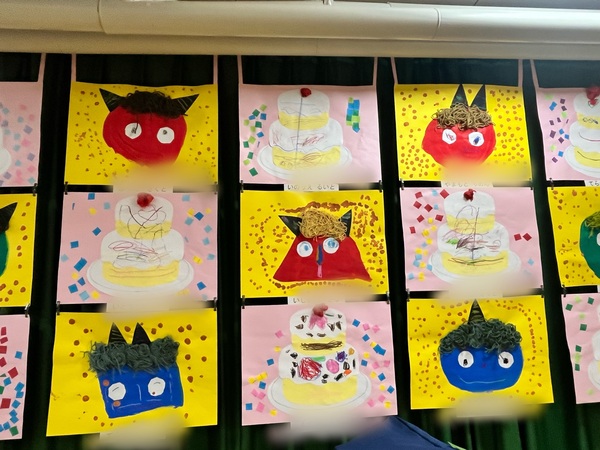 年少さんの絵画です。おしいしそうなケーキやかわいい鬼の絵を描きました。色々な顔がありとても楽しい作品になりました。