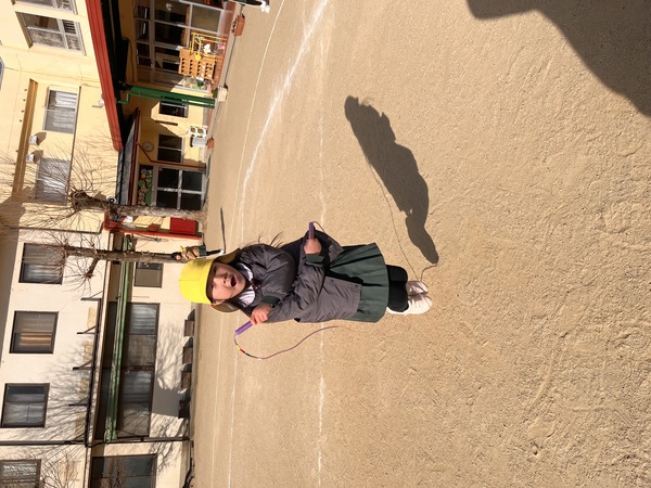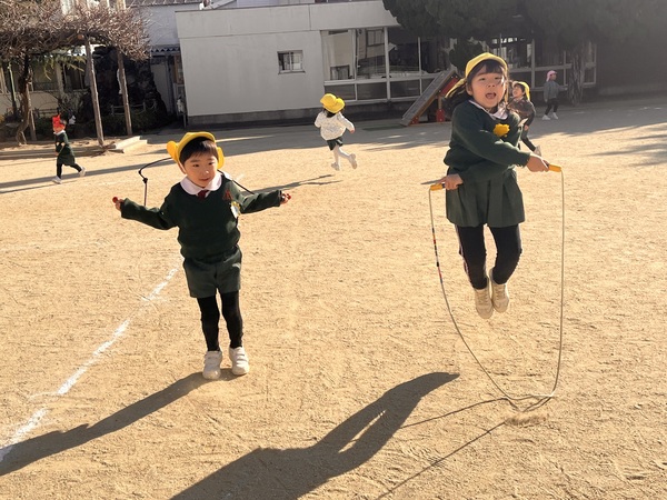 3学期に入り、縄跳びを頑張る様子があちことでみられます。前回りが100回、跳べるようにと頑張る年長さんです。