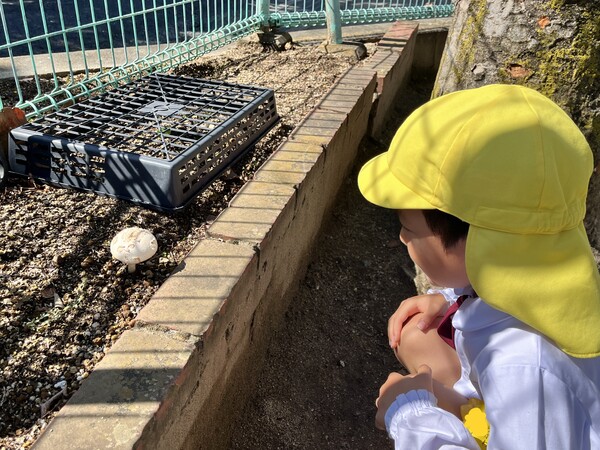花壇にキノコが生えているのを見つけたお友だち!「これは、なんていうきのこかなぁ」と興味深々で見ています。