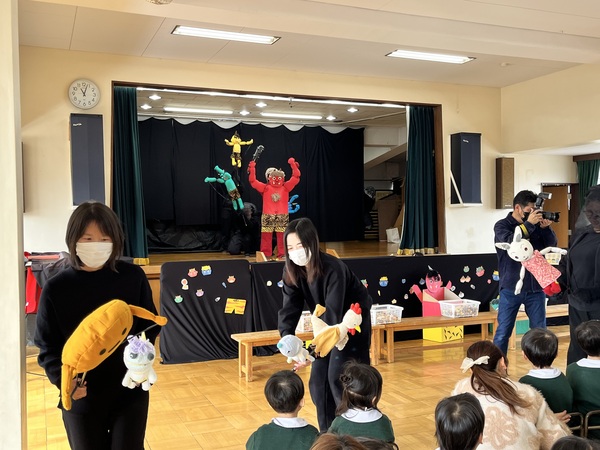 人形劇サークルのお母さま方にご協力いただき豆まきをしました。心の中にある「やだやだっ子」「泣き虫っ子」「おこりんぼ」を追い出すために鬼に豆をまきました